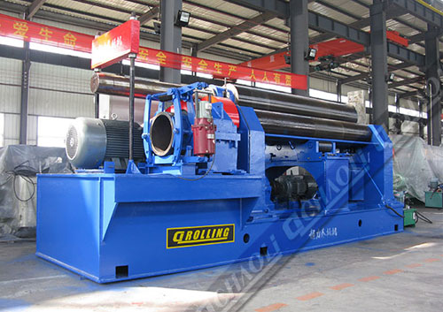 本機結構型式為三輥對稱式,上輥在兩下輥中央對稱位置作垂直升降運動,通過絲桿絲母蝸桿傳動而獲得,兩下輥作旋轉運動,通過 減速機的輸出齒輪與下輥齒嚙合,為卷制板材提供扭矩。本機床的缺陷是需借助其它設備實現預彎。本設備可卷板厚1mm-40mm,板寬8000mm的板料。