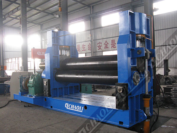 用于常溫狀態下將板材卷成圓筒形、圓弧形、圓錐形。性能優越,結構緊湊、操作方便。上輥升降、翻倒裝置采用液壓驅動。主傳動由電機通過三角帶傳遞,減速器帶動兩下輥驅動,卷制柔性好。采用PLC可編程顯示器控制,上輥升降采用位移傳感器檢,測數顯表顯示。提高產品效率和產品質量,翻倒架采用液壓翻倒。